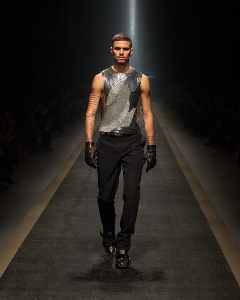 Versace’s Fall-Winter 2025 collection is a stunning reinvention of its iconic heritage, blending the grandeur of its past with a bold, modern sensibility. Donatella Versace seamlessly intertwines sculptural silhouettes, punk-inspired deconstruction, and opulent materials to create a collection that speaks to empowerment, individuality, and timeless artistry. From gravity-defying corseted dresses and voluminous knitted jackets to statuesque tailoring for men, each piece exudes confidence and audacity. The vibrant prints, infused with archival motifs, and the new V-shaped emblem elevate the collection, making it not only a fashion statement but a bold declaration of freedom and innovation. With its perfect balance of rebellion and refinement, Versace proves once again that true style is not bound by tradition but forged in the spirit of bold self-expression.