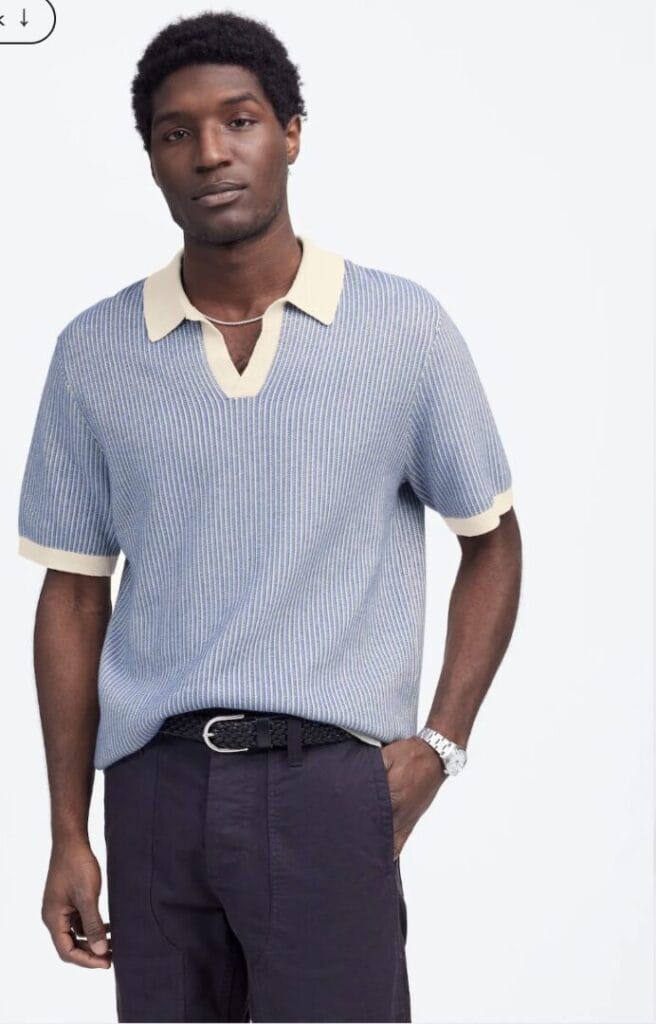 There is no menswear name quite as iconic as Todd Snyder in the last decade-and-a-half, and his SS25 collection is more of a reason to cop this season. This knit menswear polo in soft cream, sage, and pink creates a raspberry blend in a breathable cotton that’s both slouchy, yet chic. The relaxed cut is true to its laid-back look with a buttonless placket, no pockets, an elongated collar, and pullover style making it an easy piece that lets you play the mesh trend without the full commitment.
