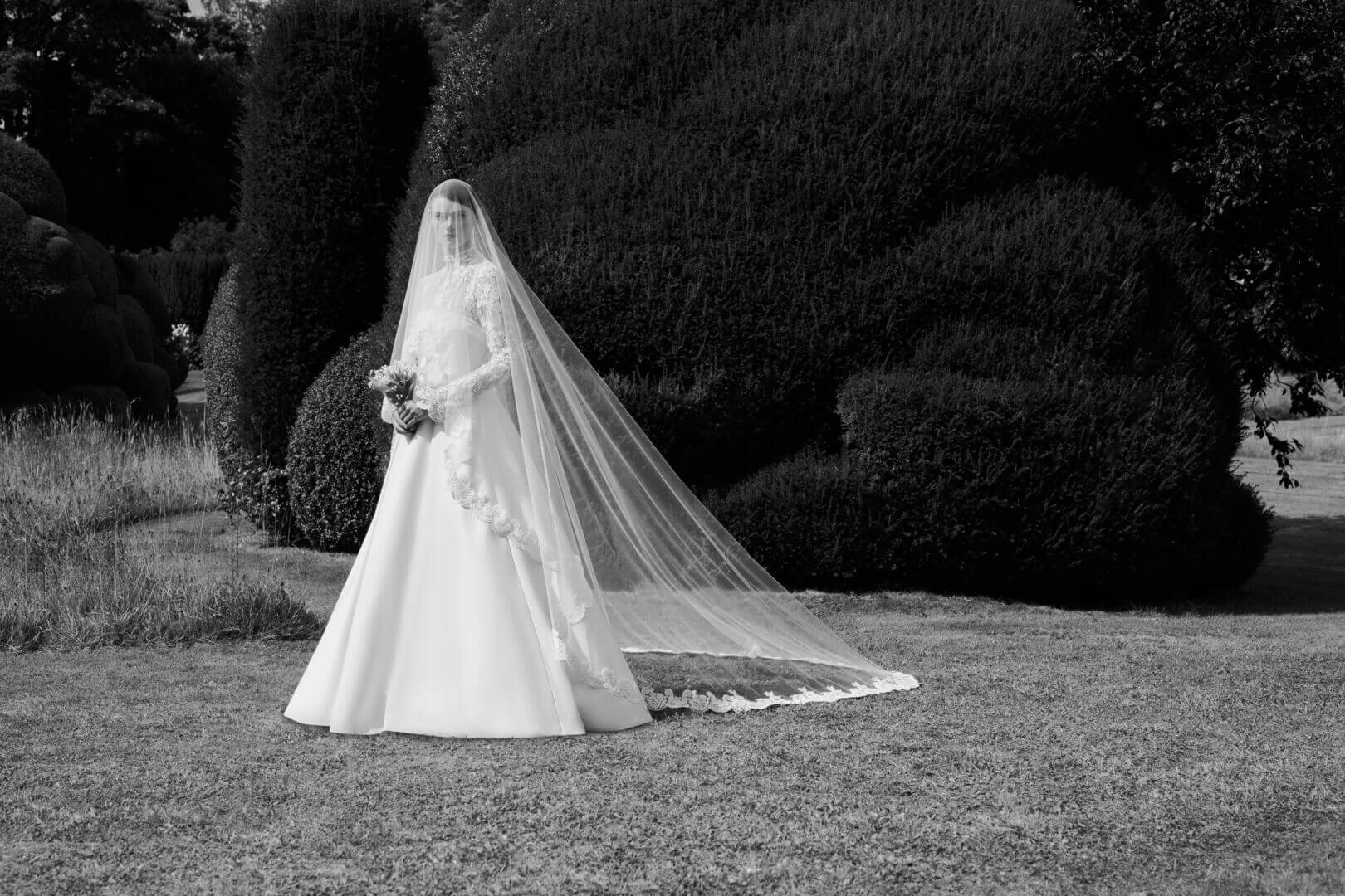 ‘s former home in Wiltshire, the collection channels the spirit of these influential women. Floral motifs in silk jacquard, intricate lace designs, and grand, sculptural dresses in ivory tones reflect Wickstead’s ability to fuse tradition with contemporary fashion. Each piece is a testament to the detailed craftsmanship that goes into creating these magnificent gowns.