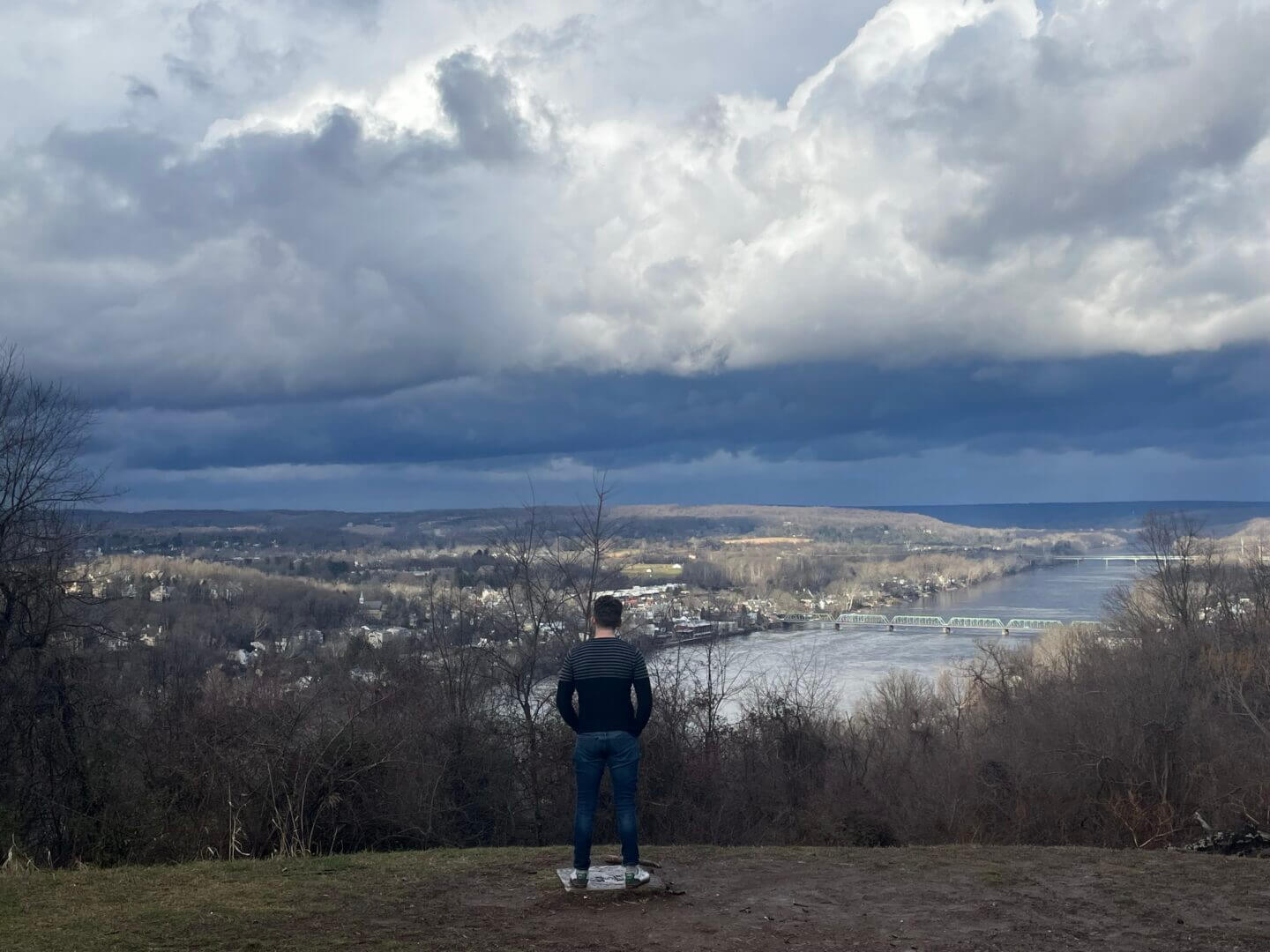 In preparation for the Fire and Ice therapy, our Saturday morning began with a Meditation walk from Chimney Hill Estate to the beautiful and historic Goat Hill Overlook. We estimated the hike to be approximately a mile and a half to just under two miles. With a gentle incline, it’s suitable for most people, even someone like me who doesn’t “hike” too often. Marek led the group to the summit at a comfortable pace, encouraging us to disconnect from technology (in order to start reconnecting with our inner selves). We silenced our phones and put them away, though when we reached the top, we took them out to photograph the lovely view over the Delaware River, Lambertville, and New Hope, Pennsylvania.