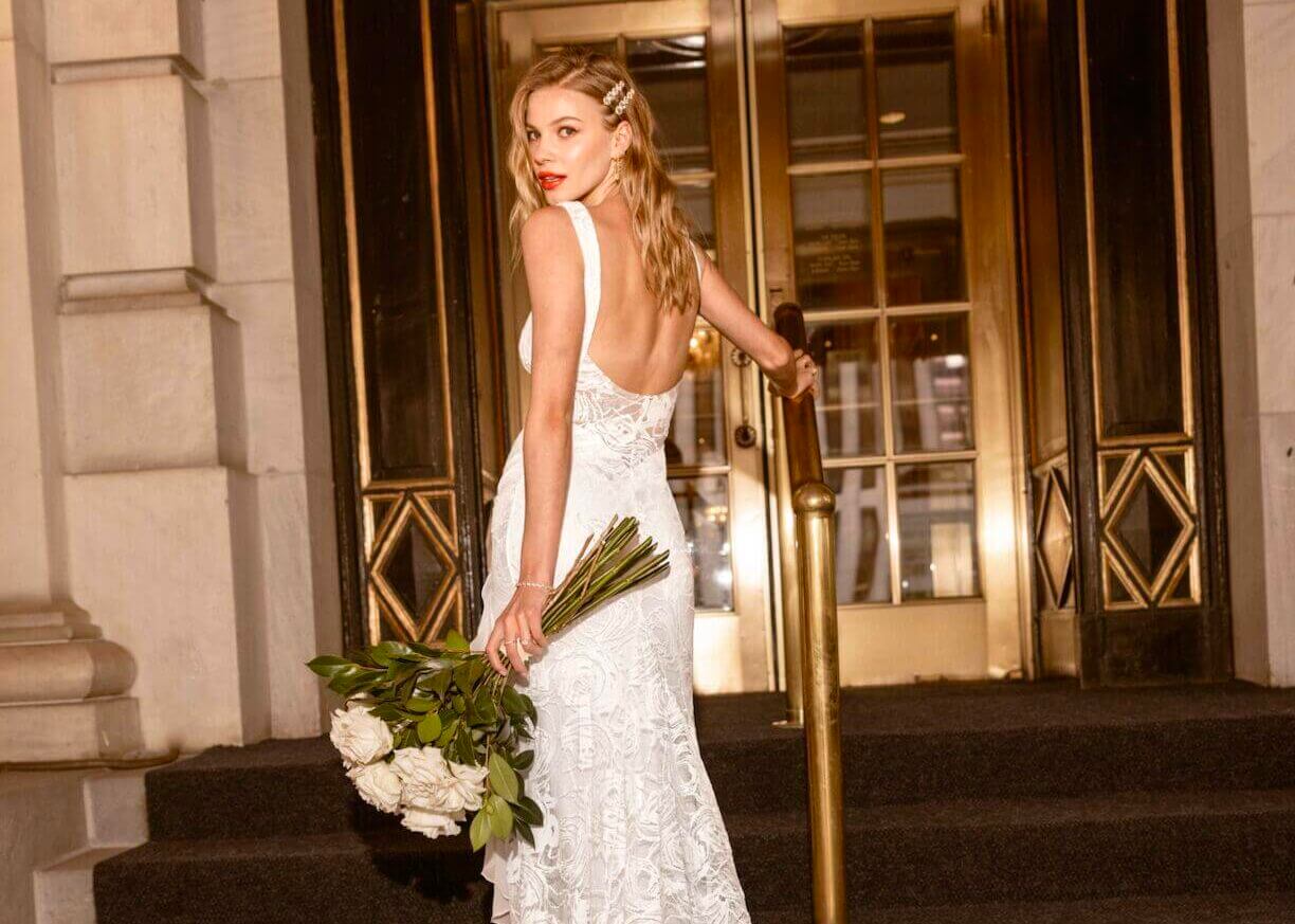 The newest addition to the Grace collection, Dahlia ($3,200), embodies truly feminine details and celebrates romance and passion. Grace Loves Lace recommends airing the Dahlia with the Lumi Veil ($440) – a bridal accessory that is both chic and sustainable.