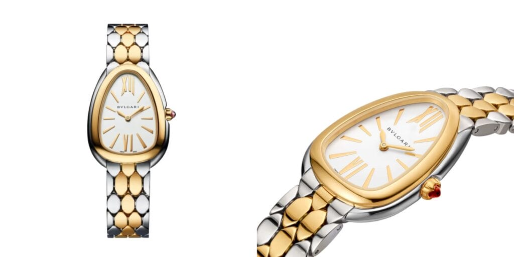 The Serpenti Seduttori remains one of BVLGARI’s most iconic silhouettes. With its teardrop-shaped case and two-tone gold-and-steel bracelet, it merges sensuality and structure. Every curve reflects the brand’s heritage of Italian craftsmanship. It’s a striking piece that feels both powerful and wearable, a gift that makes a statement without saying a word.