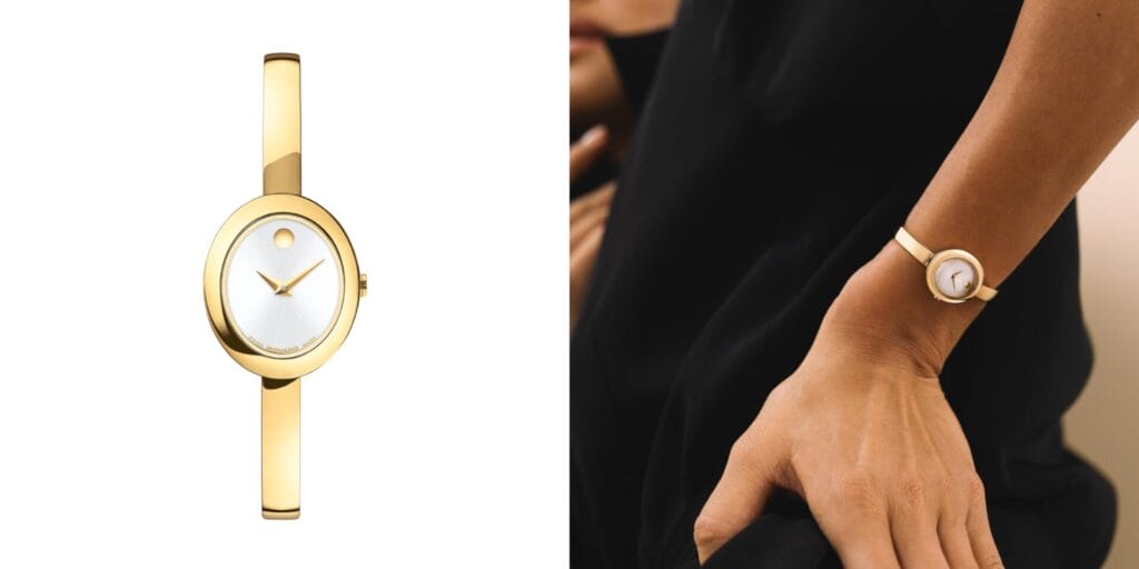 Minimalist and refined, Movado’s sculptural bangle delivers quiet luxury that pairs with everything.