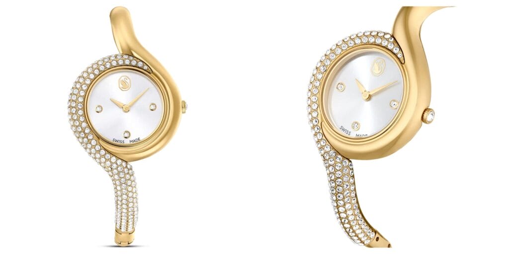 A curved gold form with crystal detailing, Swarovski’s Dextera watch brings a touch of celebration to the wrist.