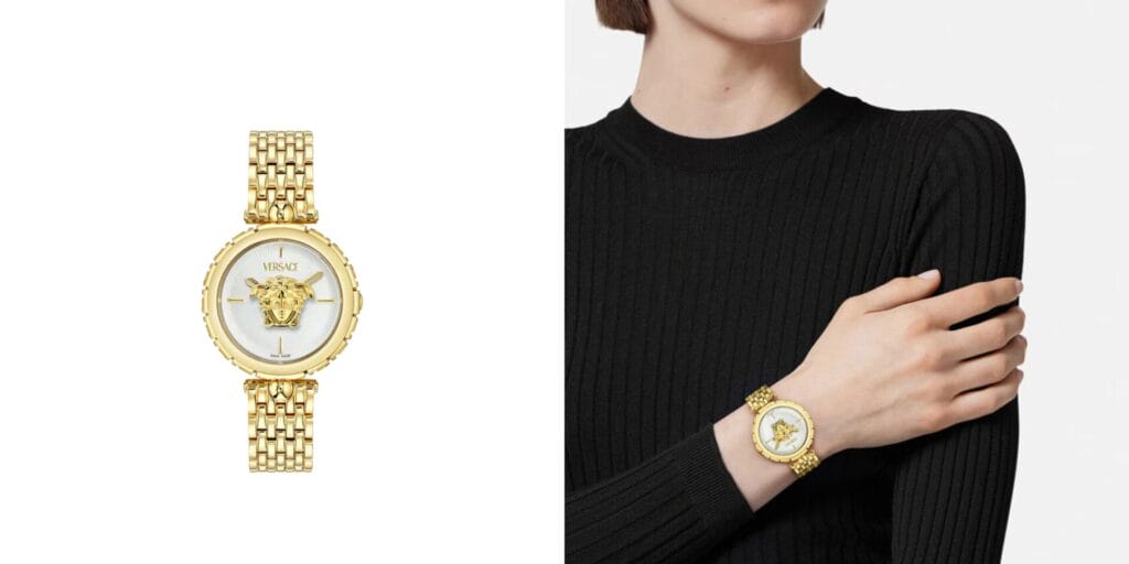 Few symbols in fashion carry as much power as Versace’s Medusa. Here, it takes center stage on a sleek gold-tone watch that feels both classic and daring. The textured dial and polished bracelet echo the brand’s opulent codes, while the minimalist markers keep it wearable for every day. It’s dramatic without being loud, a gift that adds a confident edge to any collection.
