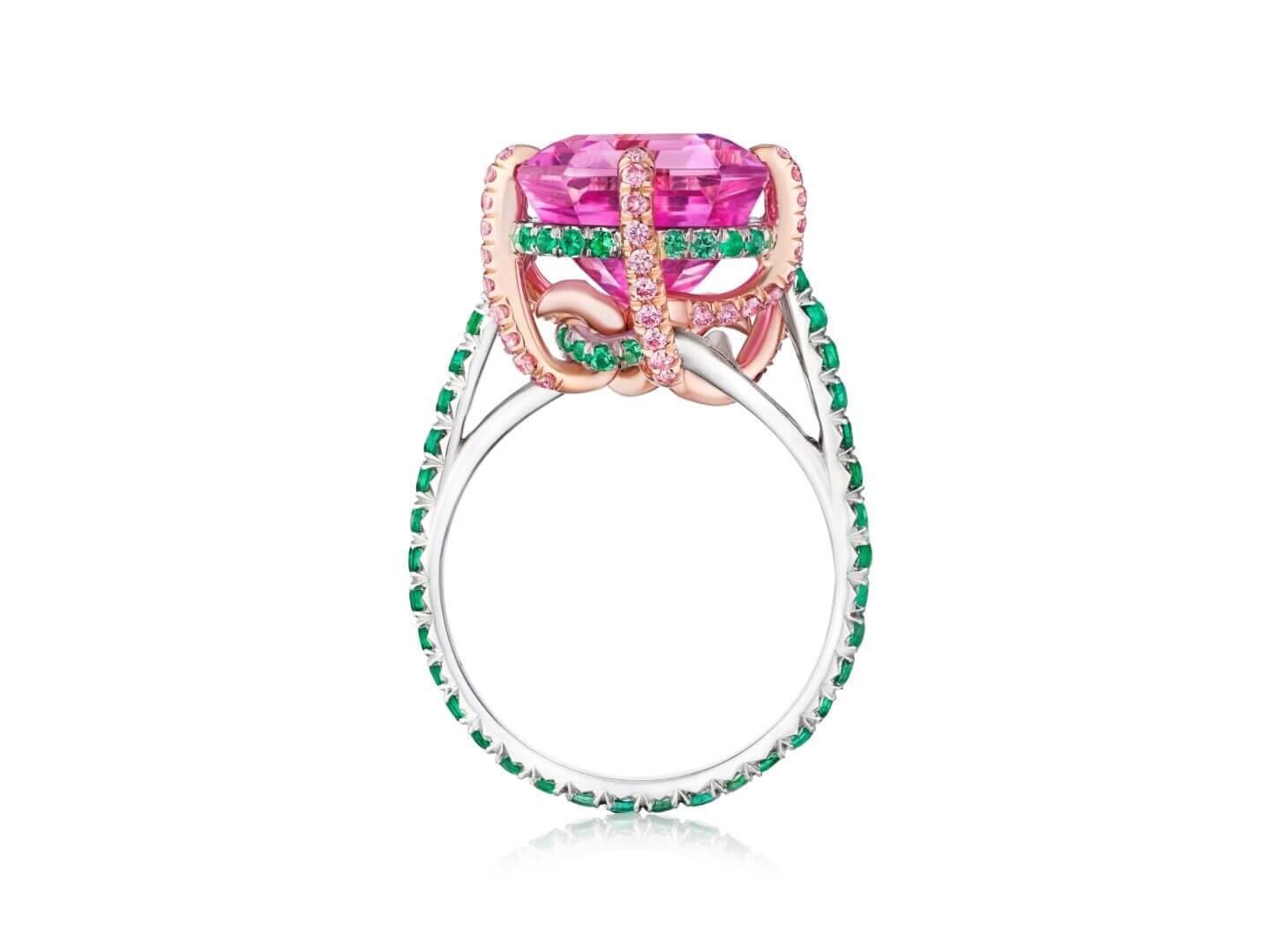 The Sapphire Medusa Ring by JJR captures the essence of the candy-colored gem trend for 2024 with its vibrant pink and green hues. Showcasing a 9.09-carat natural Ceylon Purple-Pink Sapphire, 0.5 carats of Fancy Intense Pink Diamonds, and 1 carat of Emeralds, this ring is at the forefront of the candy-colored gem movement. JJR is known for creating fashion-forward pieces that endure generations. The bold hues of the Sapphire Medusa Ring set the stage for the 2024 fashion scene, highlighting the bright and lively tones that will dominate.