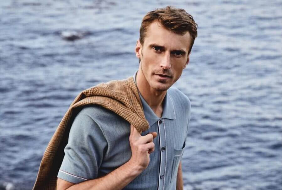 Riviera Sweater Polo: The tipping on the collar, placket, arm cuffs, pocket, and waist hearken back to a favorite off-duty style of Hollywood’s leading men in the Sixties. It can be worn by itself or layered like a cardigan over a tee for an instant style upgrade. Image courtesy of Todd Snyder