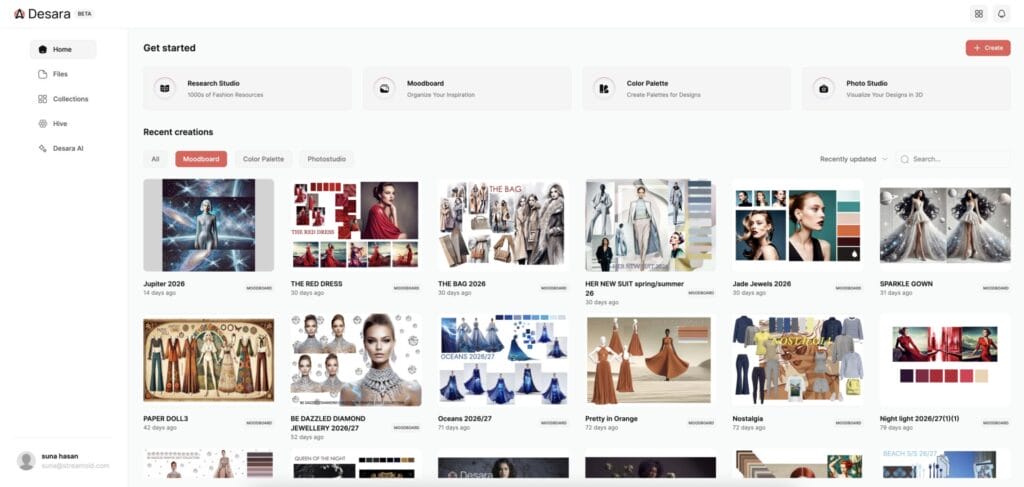 The Desara homepage serves as a dynamic hub, seamlessly integrating essential tools such as the Research Studio, Mood Boards, Color Palettes, and Photo Studio. This centralized access empowers users to navigate their creative workflows effortlessly.