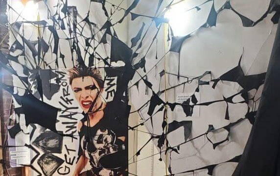 Jennifer Elster’s Paintings that beckon and warn. Art pieces that one must puzzle together to figure. Portraits provoke surreal realizations and desperate fear. And with comedy, horror, pathos, and style, she weaves in mementos from her earlier life and career, including an installation and artifacts from her avant-garde styling work with David Bowie for his album Outside, photographed by John Scarisbrick. Elster brought this early work to new life with words, paint, and serrated pieces creating a web of sorts.