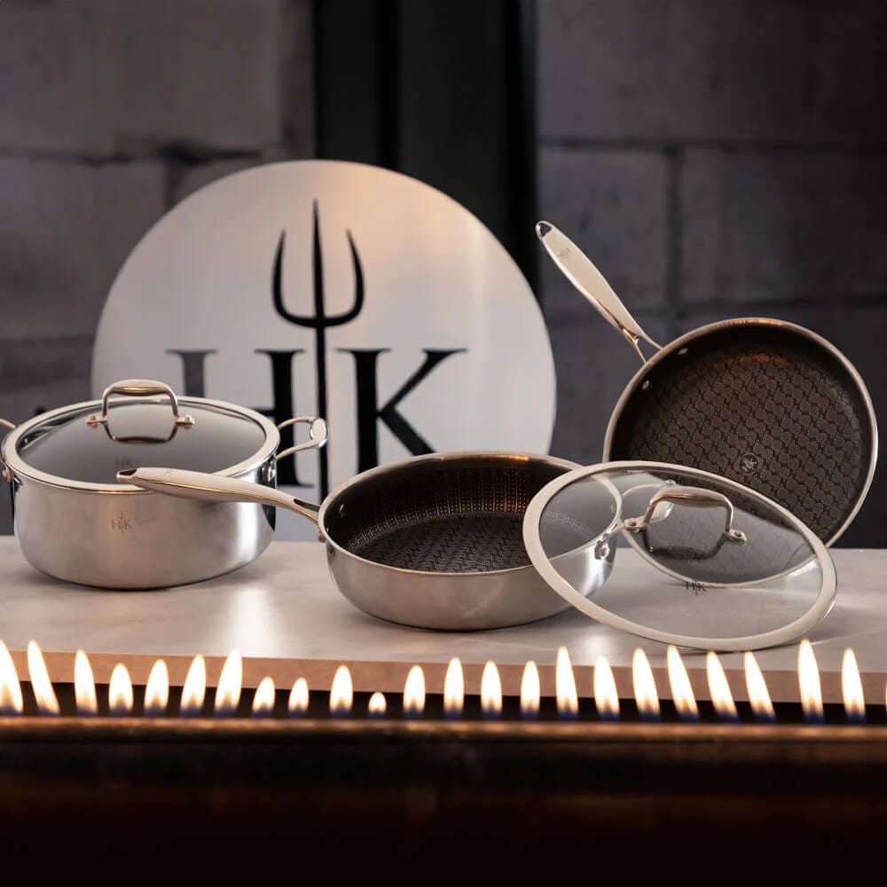 Hell’s Kitchen is where great chefs are found, forged, proven. In Hell’s Kitchen, the next great chef is you…and now you have an affordable solution you can experience your own hybrid cookware revolution! Includes: 11″ Fry/Skillet Pan, 4 Qt Saute Pan, 7.5 Qt Pot and Two TEmpered Glass Lids