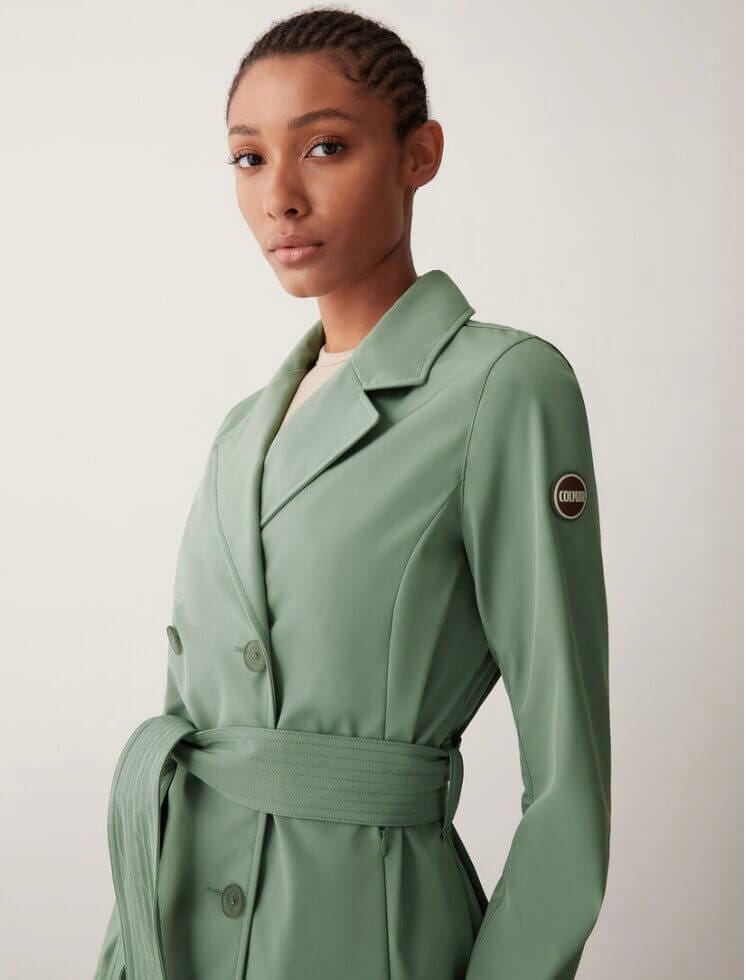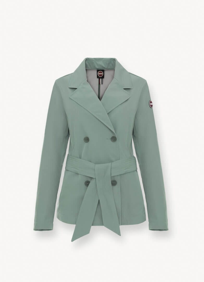 A cropped, double-breasted trench, with belt to enhance silhouette, is made from waterproof and breathable stretch soft shell fabric with a water-repellent treatment. This jacket combines technicality and elegance without forgetting about practicality and is perfect for stylishly defying sudden weather changes come rain or shine.