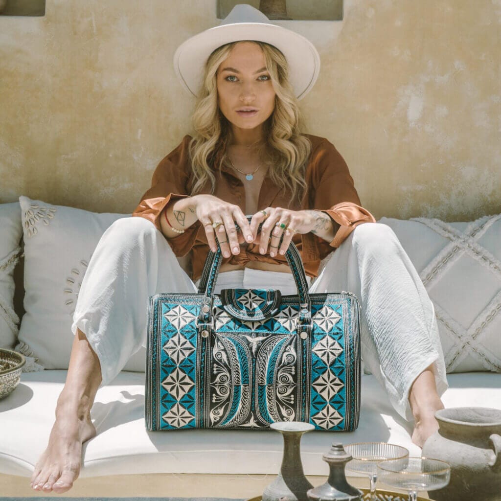 The Memetika Mini Weekender Bag by Banda Bags is an eco-chic essential for short trips and everyday use. Crafted using traditional paddle-wheel sewing, its intricate embroidery showcases unique artisanal patterns, highlighting the brand’s commitment to both eco-friendly materials and exquisite craftsmanship.