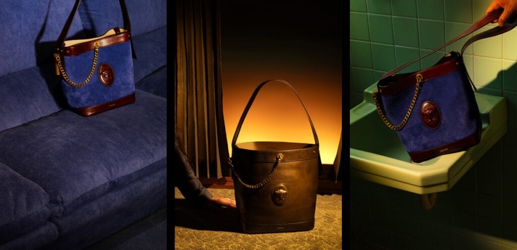 A sculptural reinterpretation of the bucket bag featuring the iconic Medusa emblem, crafted with convertible styling and luxurious leather finishes.