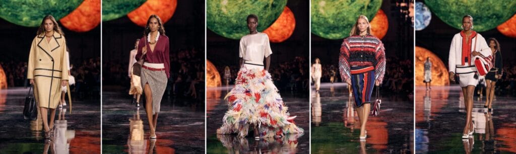 The show unfolded under a ceiling of suspended planets, but it was the clothes that held attention. Tweed tailoring came with a new ease, wide-leg trousers replaced pencil skirts, and delicate metallic detailing added just enough shine. There was movement in every look. Cropped jackets swung, feathers caught the light, and nothing felt overworked. Blazy stripped away the stiffness that’s crept into Chanel in recent years and replaced it with energy. This was confident, considered, and cool. A fresh start that made Chanel feel relevant again.