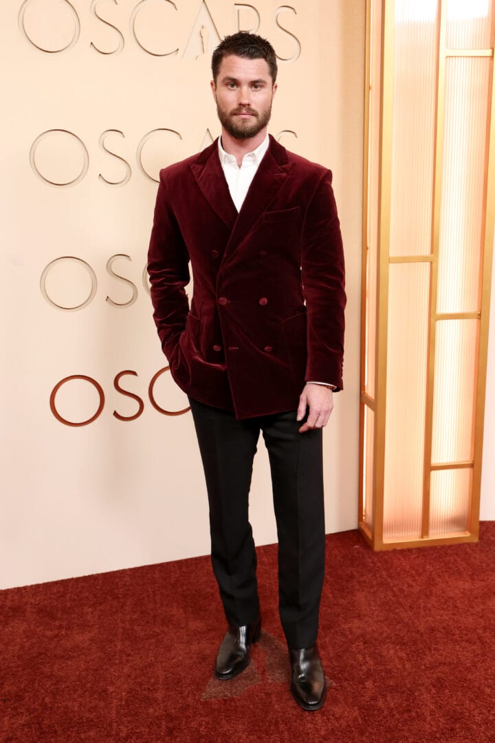 American actor Chase Stokes, nominated for his performance in The Last Horizon, made a striking appearance on the 2026 Oscars red carpet in a Dunhill Autumn Winter 2026 ensemble. The deep red cotton velvet Bourdon high-break peak lapel double-breasted jacket immediately commands attention, while the crisp white cotton contrast point collar evening shirt with round bib and tailored black wool barathea double-pleated evening trousers provide perfect structure and balance. Stokes’ look demonstrates a sophisticated command of color, texture, and proportion, presenting a polished, red carpet-ready interpretation of modern menswear that complements his status as one of this year’s most acclaimed actors.