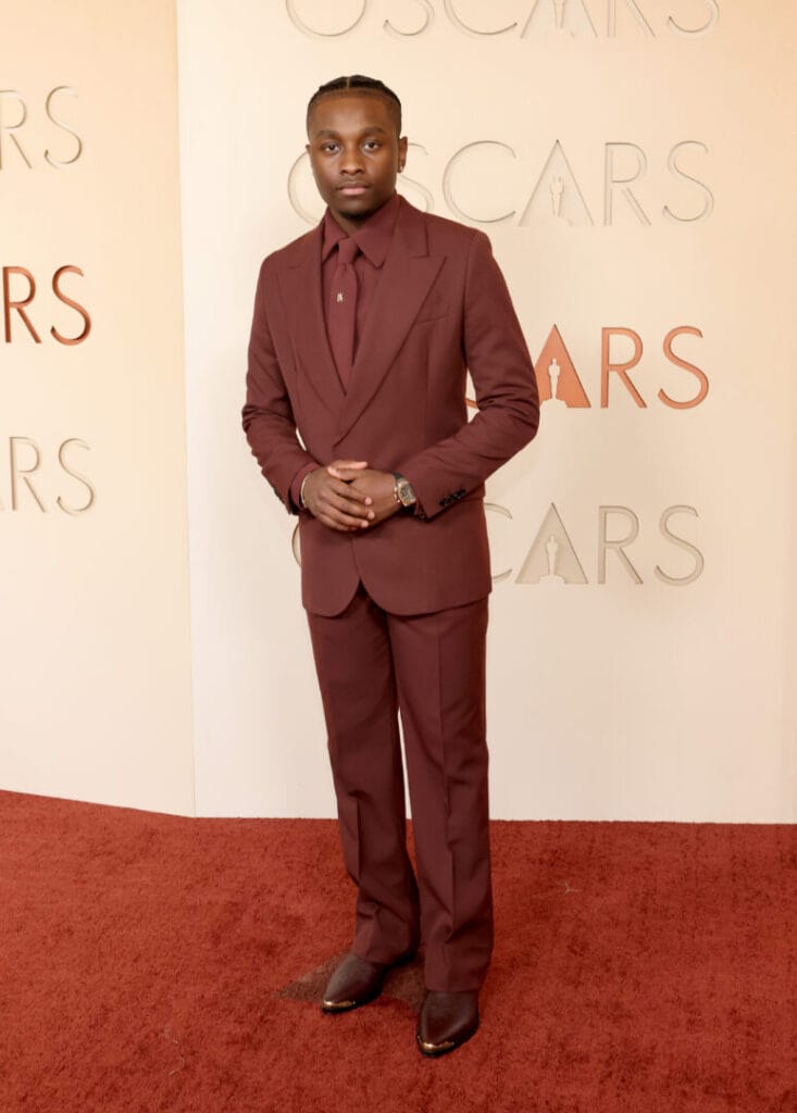 American actor Miles Caton, recognized this year for his role in Eclipse of Tomorrow, made a polished appearance at the 98th Academy Awards in custom AMIRI tailoring. The deep plum single-breasted jacket layered over a matching shirt and tie created a streamlined, cohesive silhouette, while MA Fit trousers maintained clean tailoring and proportion. Completing the look, the leather MA pointy boots added a modern finish that complemented the tonal palette. Caton’s outfit demonstrates a refined understanding of color coordination and contemporary tailoring, presenting a red carpet-ready look that balances sophistication with subtle personality, perfectly suited to his status as one of this year’s celebrated actors.