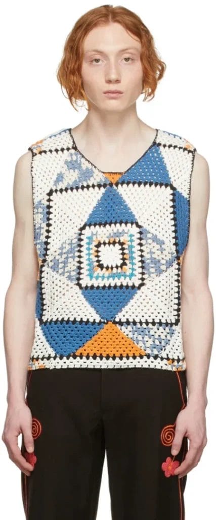 Bode – Sleeveless crochet knit cotton tank top in blue, yellow, and white. $387.