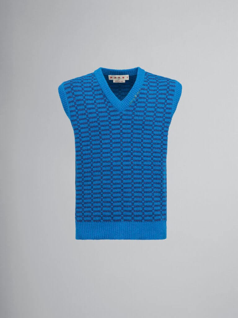 Marni – Sleeveless V-neck sweater. Check jacquard on the front, stocking stitch back. Regular fit. Made in Italy. $570