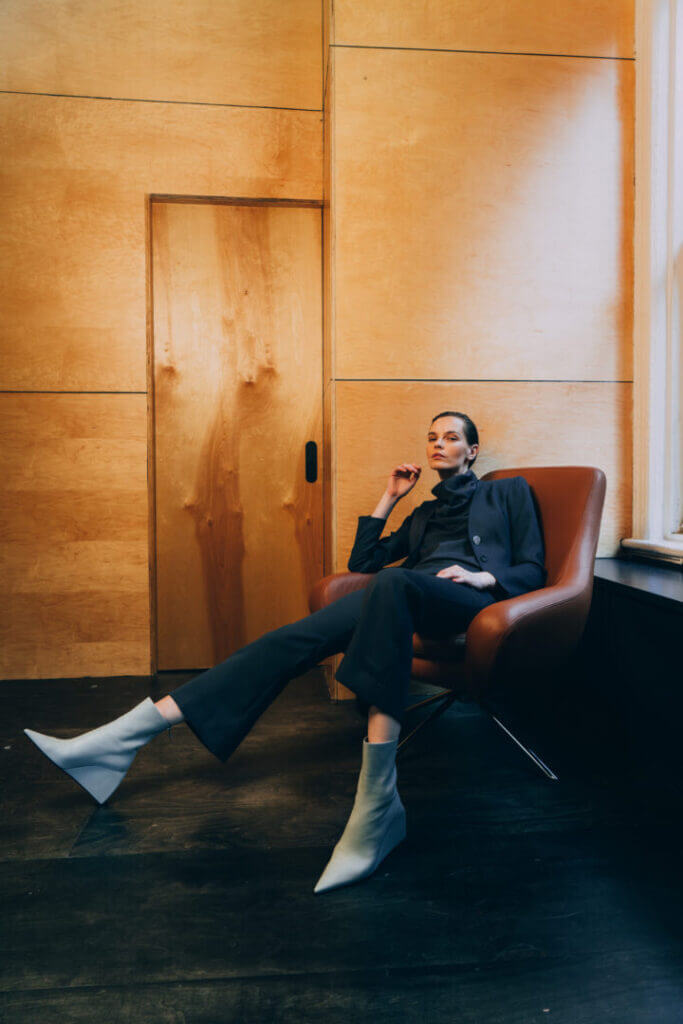 Courbe Bandana Top, sustainable tech twill shown in Mineral.Achier Fitted Jacket, stretch broadcloth, shown in charcoal