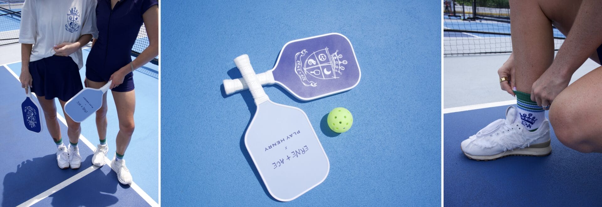 Leading the charge is Erne + Ace, a New York-based label debuting with an 11-piece collection that captures the pulse of the city. Highlights include varsity and bomber jackets splashed with graffiti style doodles, sleek navy rompers and skirts built for play, and cheeky additions like embroidered “Court Sisters” trucker hats and pickleball paddles stamped with the brand’s crest. Even the socks get a stylish update, proving no detail is too small when it comes to courtside cool.