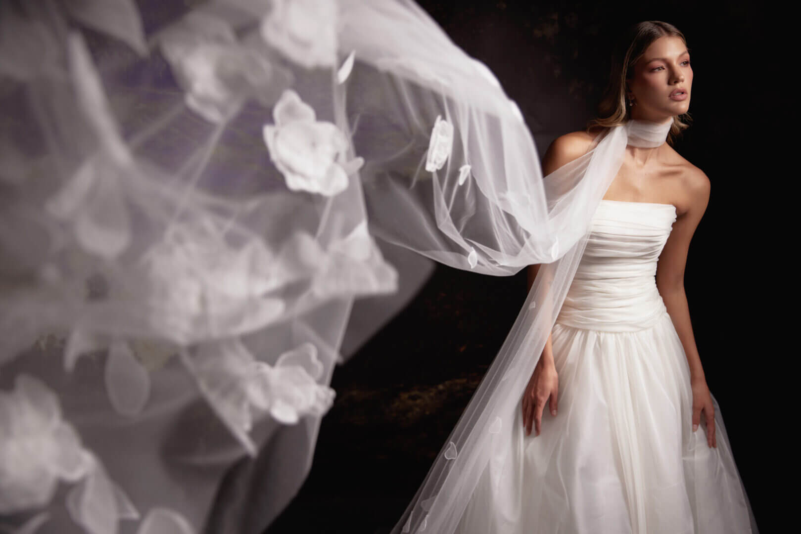 Nadia Manjarrez: Sometimes we’ll choose fabrics we know our brides love and that have worked well for us in the past, and other times we pick fabrics that really align with the inspiration for the collection. The Fall 2025 collection is a blend of both. For example, the “hand-painted” organza was one of the first ideas we developed because it ties directly into the whimsical, artistic feel of the collection. On the other hand, we used corded lace to bring in a more refined touch. Our faille, which has been a favorite in previous collections, also played a key role since it compliments the overall aesthetic. It’s really about balancing what brides love with what tells the story of the collection.