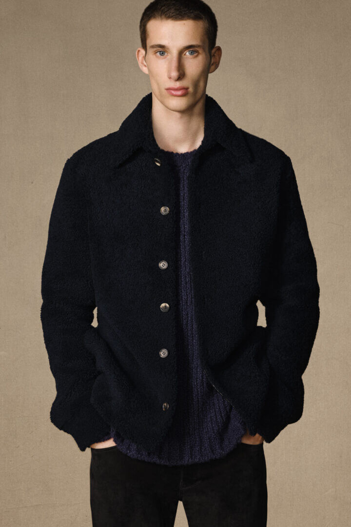 One of the most striking elements of the collection is Hearst’s ability to incorporate innovative materials while remaining firmly anchored in sustainability. The collection highlights the use of upcycled mink, vintage topcoats, and a sophisticated range of recycled materials. Upcycled mink fur, for example, is transformed into sharp, fitted tailoring and paired with slim recycled cotton denim for an arresting contrast of softness and structure. The standout moment of the season comes in the form of new techniques, such as cashmere and shearling knit together into a tactile cable knit sweater, elevating the functionality of traditional menswear while pushing the boundaries of texture.