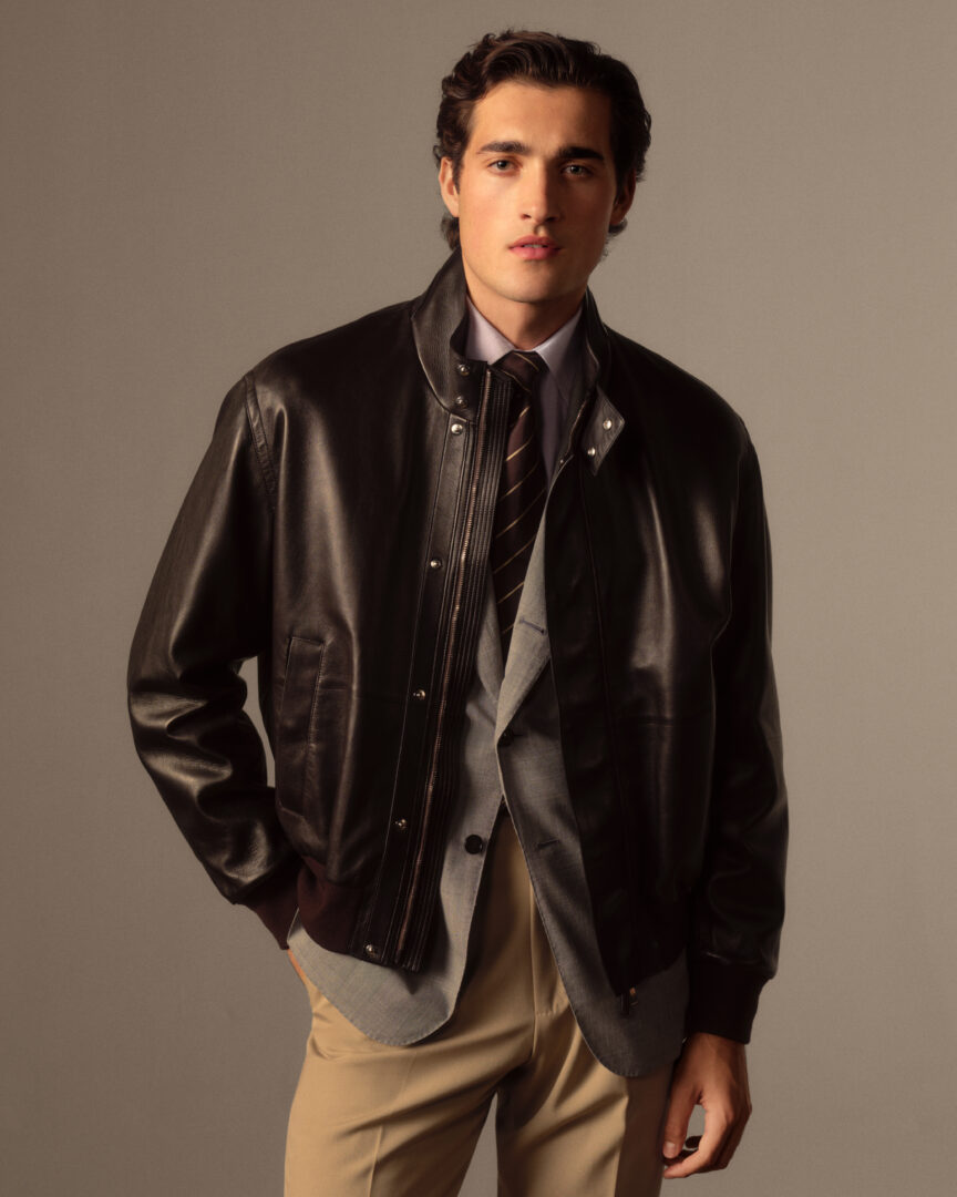 Shirts, too, contribute to this dialogue. Mixed stripe cotton-linen blends belted with silk ties, pastels softened into lavender, rose, and indigo, all convey a subtle Gatsby-esque air. The careful manipulation of texture, color, and layering allows men to explore personality without compromising refinement. Even outerwear embraces this balance: a dark brown French lambskin bomber jacket worn over a wool-silk glen check seersucker Cavendish jacket demonstrates that casual and formal can coexist instinctively, producing an unexpected yet elegant layered silhouette.