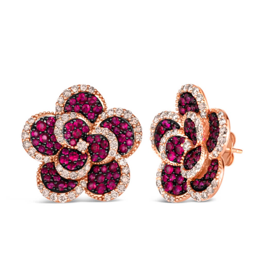 The Le Vian® Camellia Earrings feature 2 1/3 cts. Passion Ruby™, 1 cts. Nude Diamonds™ and are set in 14K Strawberry Gold® Image courtesy of Le Vian