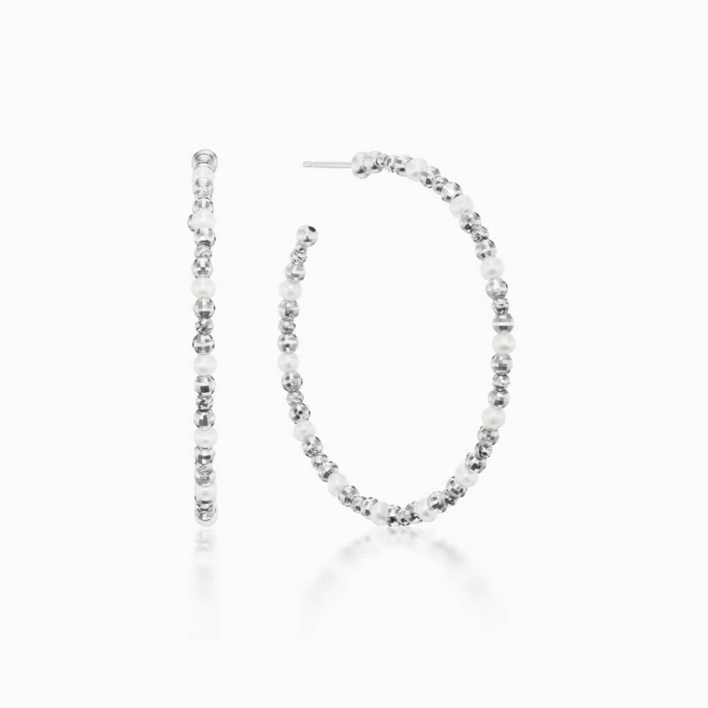 A circle of sparkling platinum beads and freshwater pearls make these captivating Platinum Born Debut Hoop earrings a stylish new take on a timeless classic. Image courtesy of Platinum Born