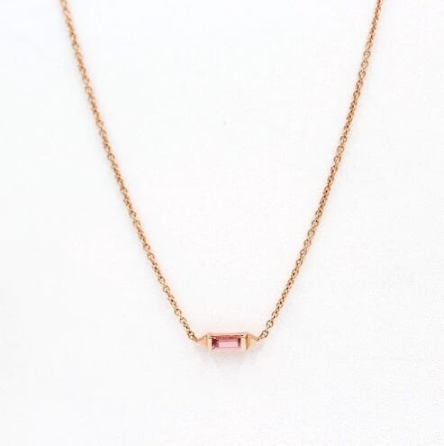 The Baguette Peachy-Pink Sapphire Necklace in Rose Gold from Taylor Custom Rings ($650) – The sapphire’s baguette shape brings a simple elegance to the pop of its peachy-pink coloring. Hung with 14k rose gold, the necklace exudes a soft feminine charm that glows against the skin. Founded in 2015 by Ashley and Jerry Taylor, the couple’s goal is to design and create earth-friendly, stunning engagement rings and jewelry their clients will be thrilled to wear for the rest of their lives. By crafting their jewelry with real lab-grown diamonds, moissanite, and created gemstones (sapphires, emeralds, rubies, and more) and recycled metals, Taylor Custom Rings creates stunning pieces that require no new mining. This ethical jewelry piece exudes Valentine’s Day with its pink hue and simplicity, making it a must for daily wear.