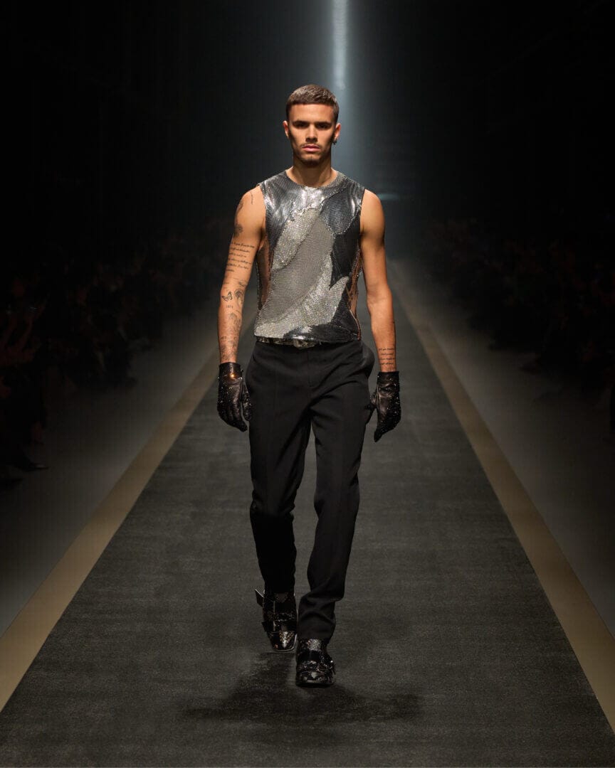 The men’s collection takes us on a journey through statuesque tailoring, exploring the tension between strictness and sensuality. Inspired by neoclassical aesthetics, Versace’s suits are impeccably crafted, their fluidity enhanced with opulent silk shirts and sculpted outerwear. The collection is bold yet sophisticated, with the fabric interplay creating a dynamic contrast between rigid structure and soft sensuality. The graphic adornments in leather and silk make a statement on their own, while every piece seems to embody a virility that is equal parts strength and grace.