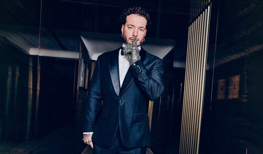 Maluma, wears a custom black double-breasted Sicilia-fit tuxedo in mohair paired with a Gold-fit tuxedo shirt. He accessorized his look with a pair of custom “Domenico” style eyewear, satin bowtie, and a gold chain bijoux.