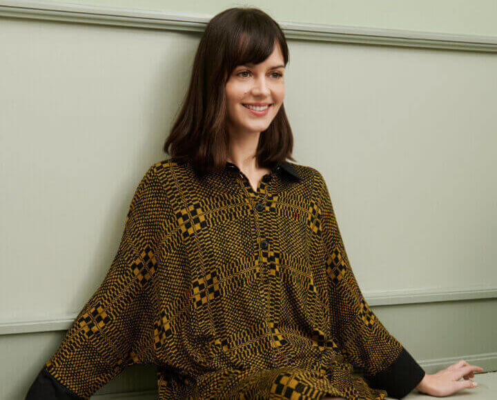 Give your look a touch of 50s nostalgia with this beautiful dress. The soft jersey fabric is tailored in an oversized cut, so it falls loosely and comfortably over the body. The dress is designed with side slit pockets and a black shirt collar and cuffs in crisp cotton that contrasts beautifully with the yellow pattern. Wear the dress with a pair of high boots for a stylish look.